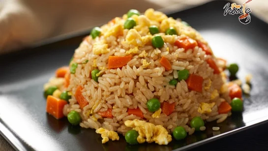Colourful veggies with tofu in savoury soy wok-tossed jasmine rice, tofu, mixed vegetables, spring onion, and soy sauce.