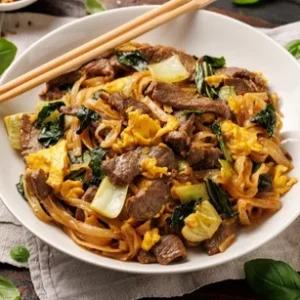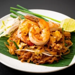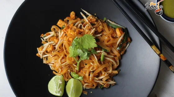 Vegetarian street-style noodles rice noodles, tofu, mushroom, onion, spring onion, beansprout, tamarind sauce, crushed peanuts, and lime.